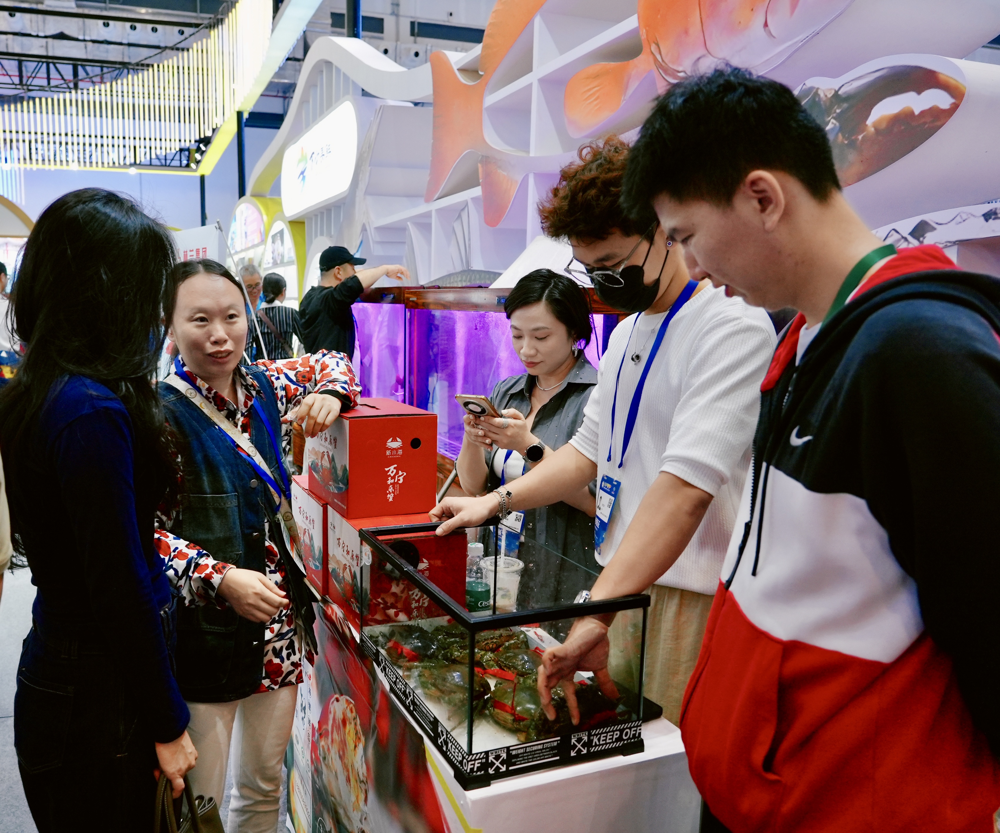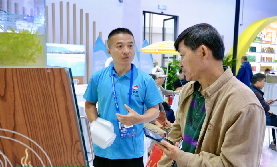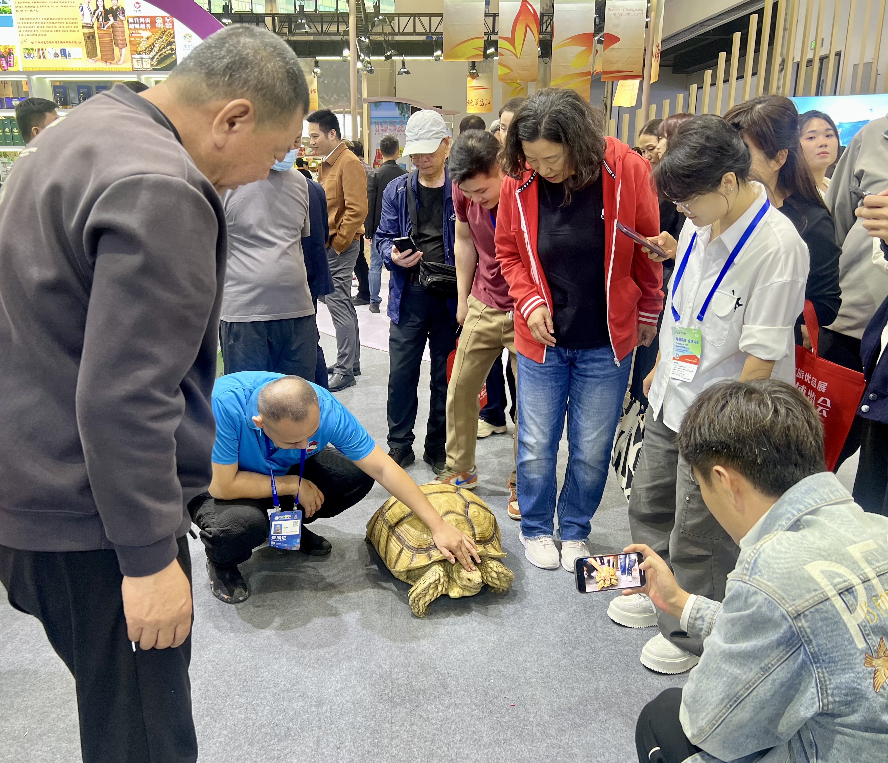 “好大的乌龟!”“它多大啦?”……展馆内,好奇与赞叹声此起彼伏。一只来自万宁龙滚成钛种养专业合作社的苏卡达陆龟成为全场瞩目的“明星嘉宾”。它重达80斤,悠闲踱步于兴隆咖啡品鉴区与水产品展销区之间,温顺憨厚的模样引得客商与观众纷纷拍照互动,现场欢声笑语不断。