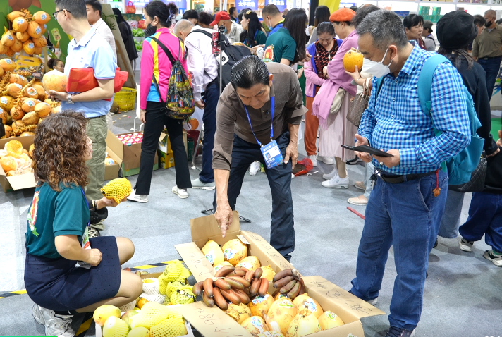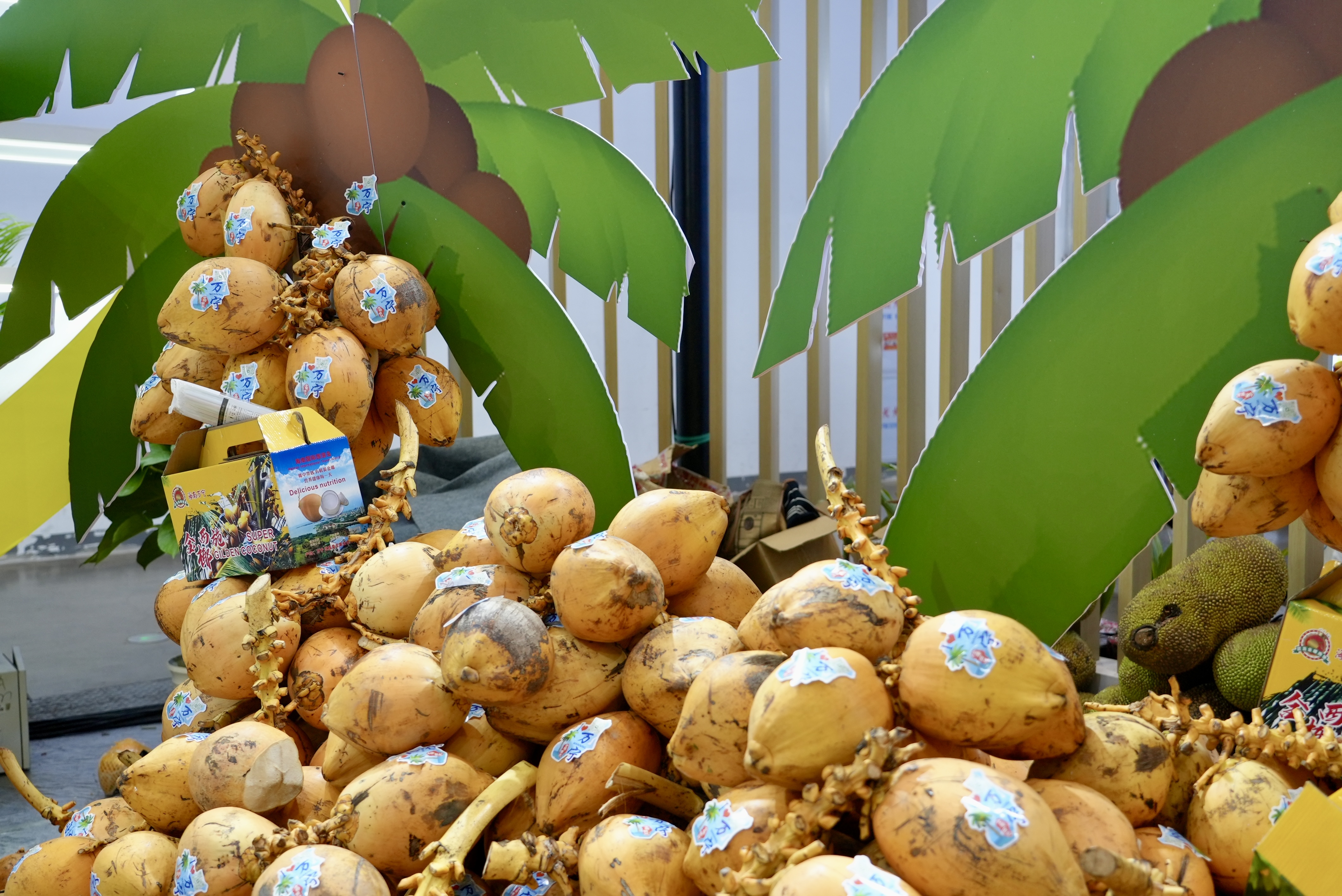 “这次我们带来了金椰子、菠萝蜜、胡椒等产品,并首次推出自助售卖机,方便游客现场扫码购买。我们基地面积约500亩,每日可装车发货5000至1万个金椰子,全年稳定供应。希望借助冬交会平台,把万宁的特色农产品推广给全国消费者。”万宁礼纪武鑫种养农民专业合作社理事长黄彩慧边招呼顾客边说道。