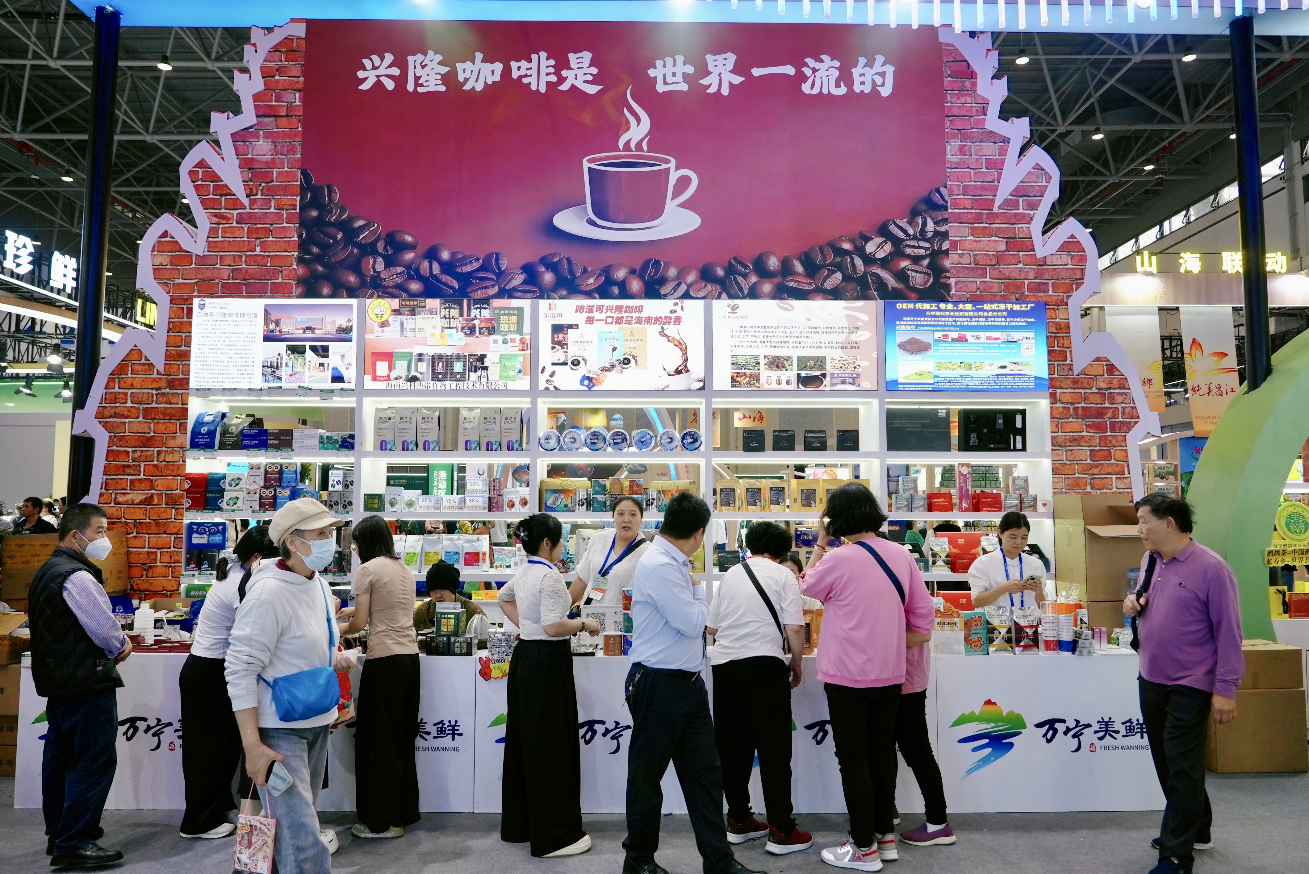 除了萌宠吸睛,万宁特色农产品金椰子也闪亮登场。在“万宁美鲜”区域公用品牌展示区,金椰子与兴隆咖啡、万宁东山羊、和乐蟹等地理标志产品同台亮相。工作人员现场讲解其种植特色与营养价值,并提供免费试饮。清甜口感赢得一致好评,展现出万宁依托热带资源优势,推动特色林果产业提质升级的扎实成果。
