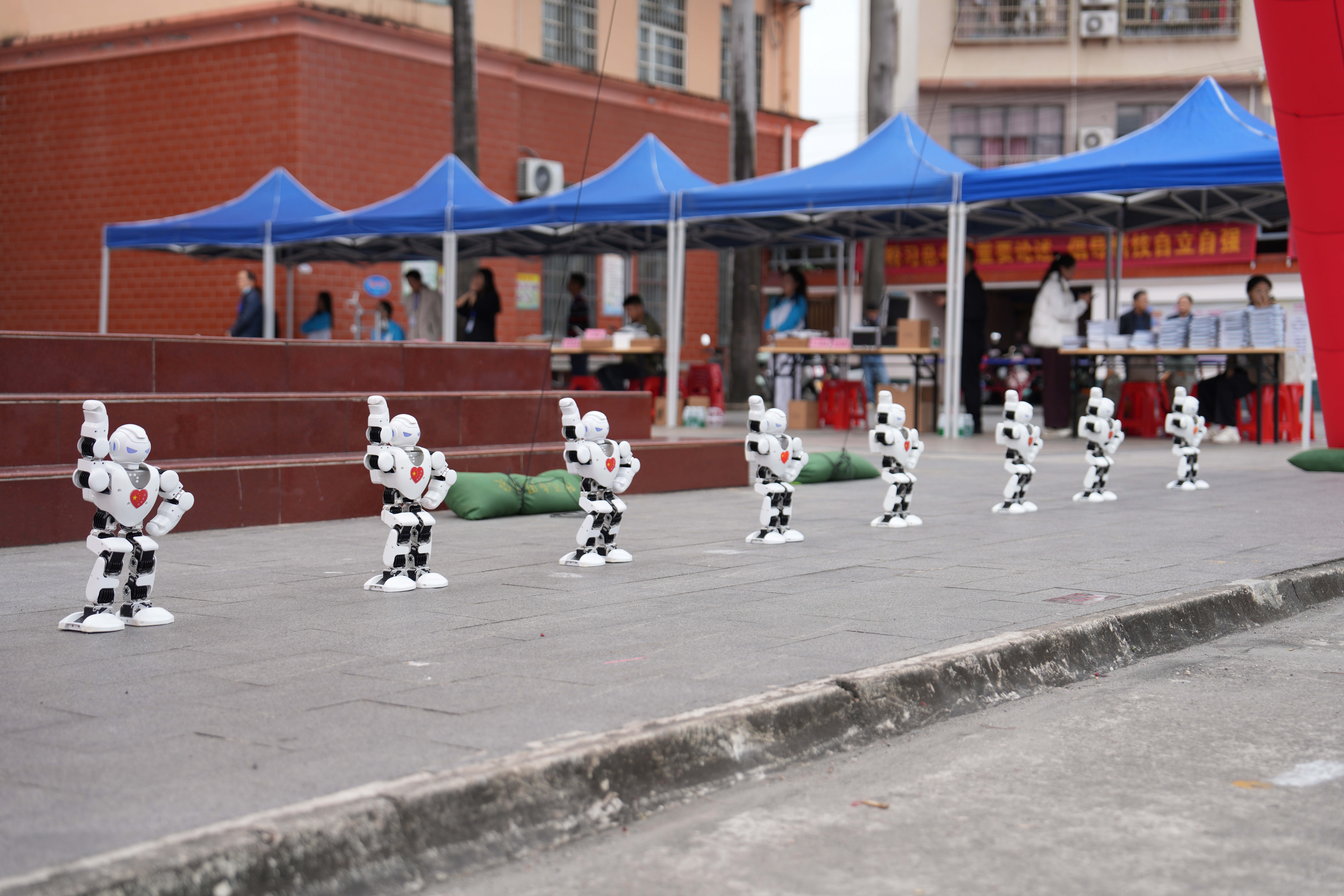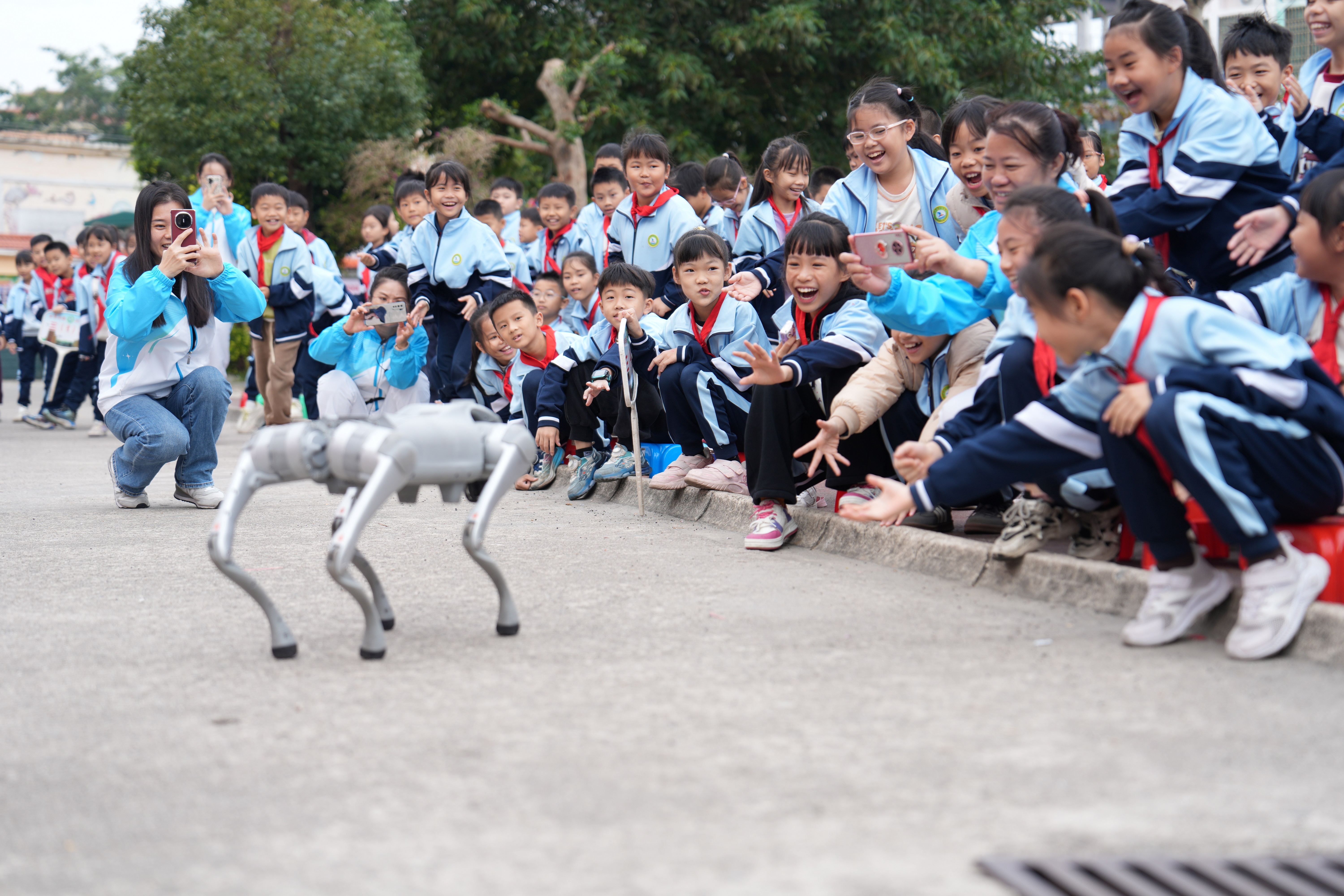 “会跳舞的机器人好厉害!”“哇!是机器狗!”活动的开场表演瞬间点燃了现场气氛。无人机编队划出炫酷轨迹,跳舞机器人节奏感十足。当一只灵活的四足机器人登场时,它的稳健行走、俏皮招手等一连串流畅动作,迅速成为全场焦点,引得同学们争相伸手,渴望与这个科技“明星”零距离互动。