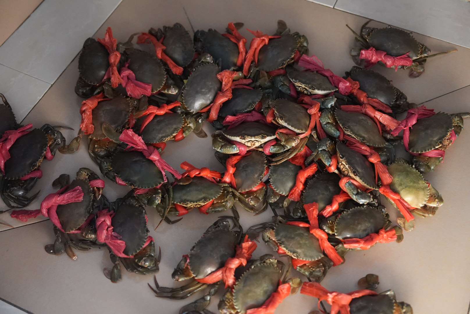 该养殖厂占地约350平方米,主要以瘦蟹和半膏蟹育肥为主,待和乐蟹膏满成熟后便及时上市。“我们从小海抽取海水,经过过滤确保水质纯净无杂质,这样养出的螃蟹基本没有泥腥味。饵料也坚持纯天然,以海白、青口、尖螺、小鱼等蛋白含量高的小海鲜为饵料,所以蟹肉清甜口感特别好。”朱振旭介绍。