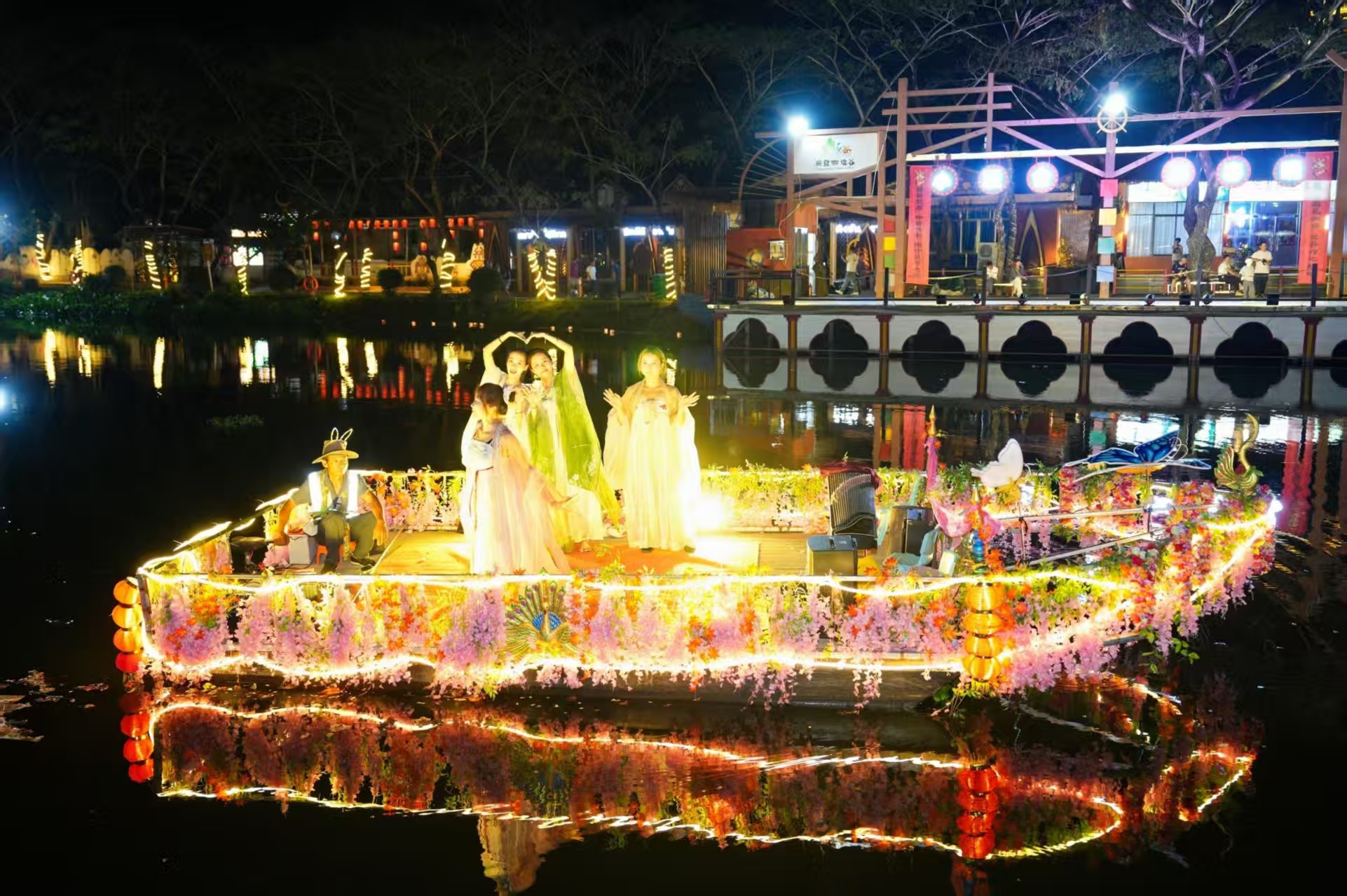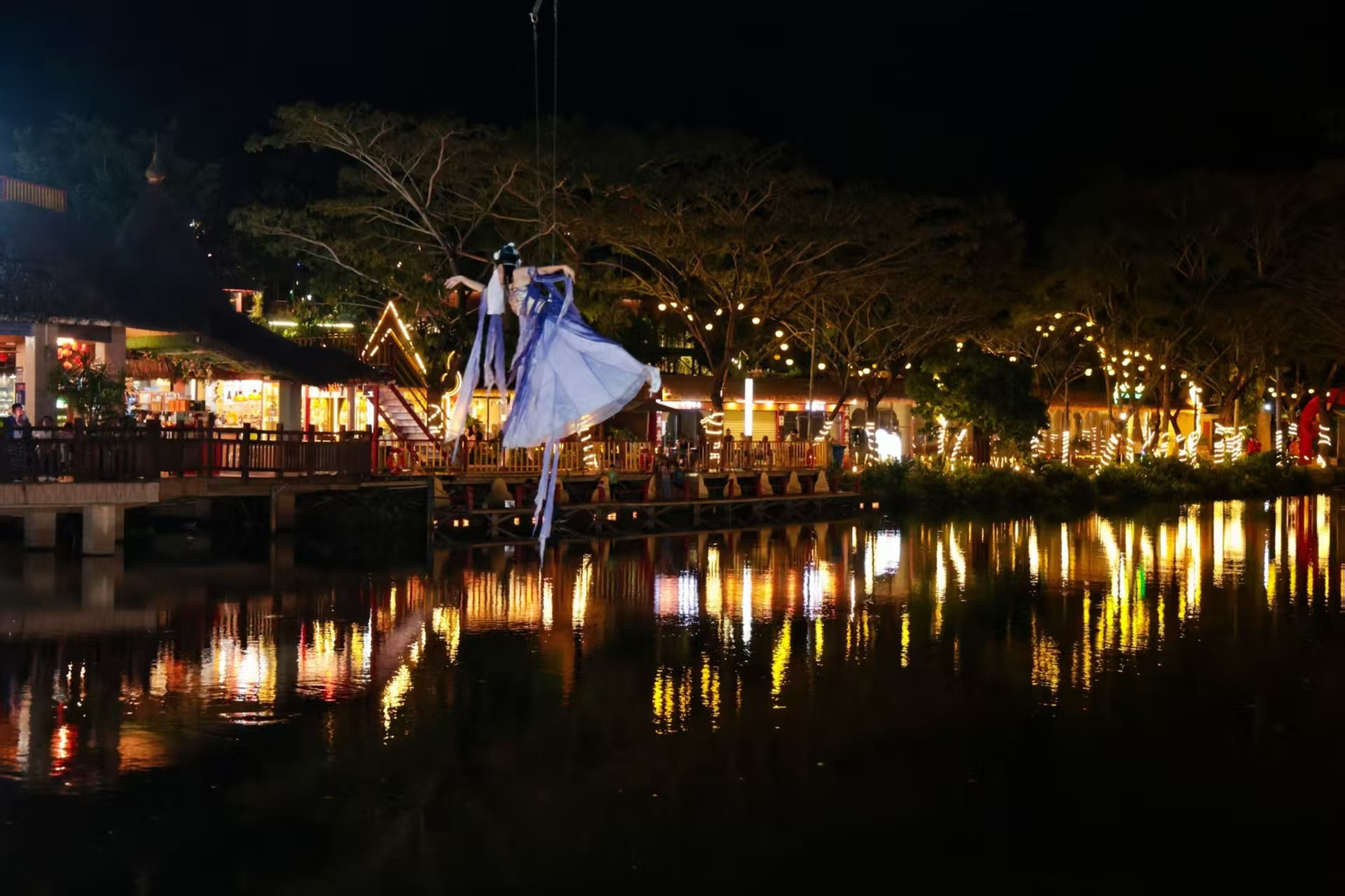 夜幕降临,非遗打铁花、火壶表演惊艳亮相,铁水流星点亮夜空;飞天凤凰、女神飞天等光影秀唯美震撼,将节日氛围推向高潮。压轴篝火晚会点燃热情,众人围火欢歌起舞,年味与暖意交织。园区还推出兴隆咖啡品鉴、南洋风味小吃、咖啡文创市集等体验,让游客在青山绿水间,品醇香咖啡、赏民俗盛宴、享团圆时光。